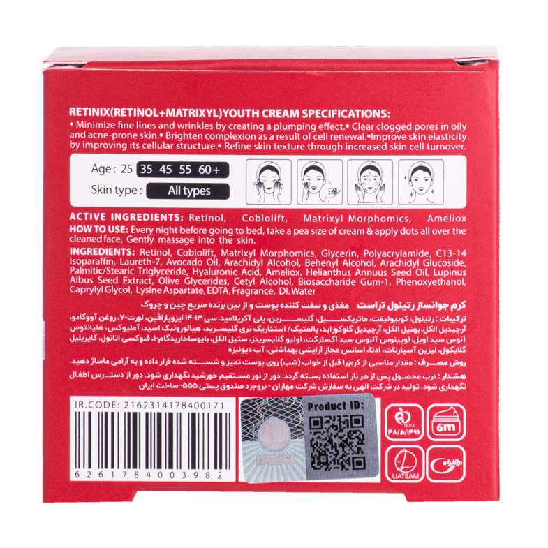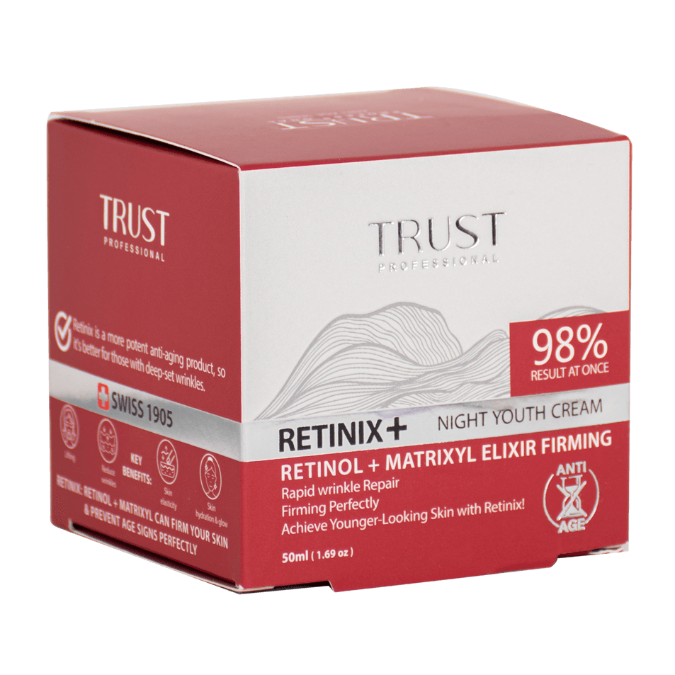 و در نهایت، آملیوکس موجود در کرم جوانساز رتینول تراست، با جلوگیری از تأثیر پرتوهای مضر UV و با خواص آنتیاکسیدانی ویژهای که دارد، چینوچروکهای پوستی را بهبود بخشیده و از شکستن و تغییر فرو پروتئین کلاژن و نیز پیری پوست جلوگیری میکند. در کنار مواد مؤثره مطرحشده، این محصول تراست، با عصاره دانه لوپینوس آلبوس، به حفظ استحکام و افزایش خاصیت کشسانی پوست، با لایزین آسپارتات، به بهبود سوختوساز سلولهای پوستی و تکثیر آنها، با روغن آووکادو، به حفظ استحکام و پایداری پوست و با هلیانتوس آنوس سید اویل، به بهبود آبرسانی و جلوگیری از پیری پوست، کمک میکند.